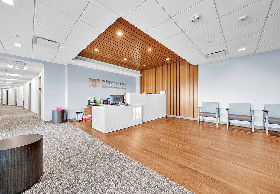The Wills Eye Hospital Cornea and Neuro-Opthalmology project was an 18,000 SF phased renovation of the 9th Floor Neuro Suite and 14th Floor Cornea Suite, designed to expand clinical capacity and support advanced ophthalmic care. The renovation added new offices, exam rooms, patient lobbies, and restrooms, while upgrading finishes, lighting, and mechanical, plumbing, and electrical systems. Additional scope included selective demolition, new automatic entrances, and rooftop unit modifications.